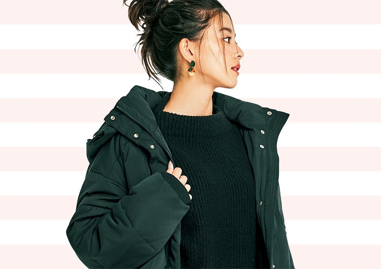 カジュアルなイメージが強いショート丈のダウンコートは、ALL黒まとめで大人っぽく着こなして。ドット柄スカートやもこもこファーのカゴバッグで、ラフな中にもさりげなく甘さをプラスします。差し色のパンプスも鮮やかカラーでなくあえて渋めグリーンを選んで、全体をシックな印象に。