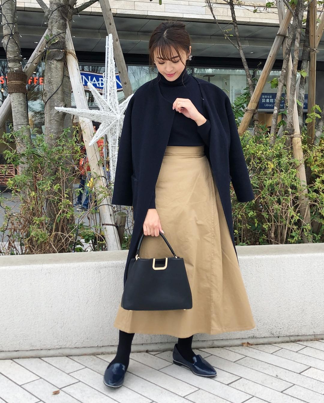 ベージュカラーのスカートは、ブラックカラーのアイテムを合わせることでシンプルにまとめることができます。タートルネックニットを合わせれば色っぽさのあるコーディネートに。小物もブラックでまとめれば、シンプルな色合いのコーディネートを楽しめますよ。