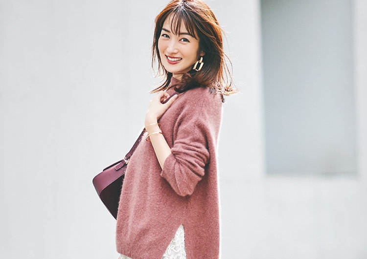 甘くなりがちなピンクのふわふわニットは、ダスティトーンで大人っぽく着こなして。くすみを飛ばす白スカートで清潔感をプラスしつつ、凹凸のあるレース素材でニュアンスを出します。ボルドーのバッグに茶系パンプスと、小物は暖色ニットとなじみのいい色をセレクト。