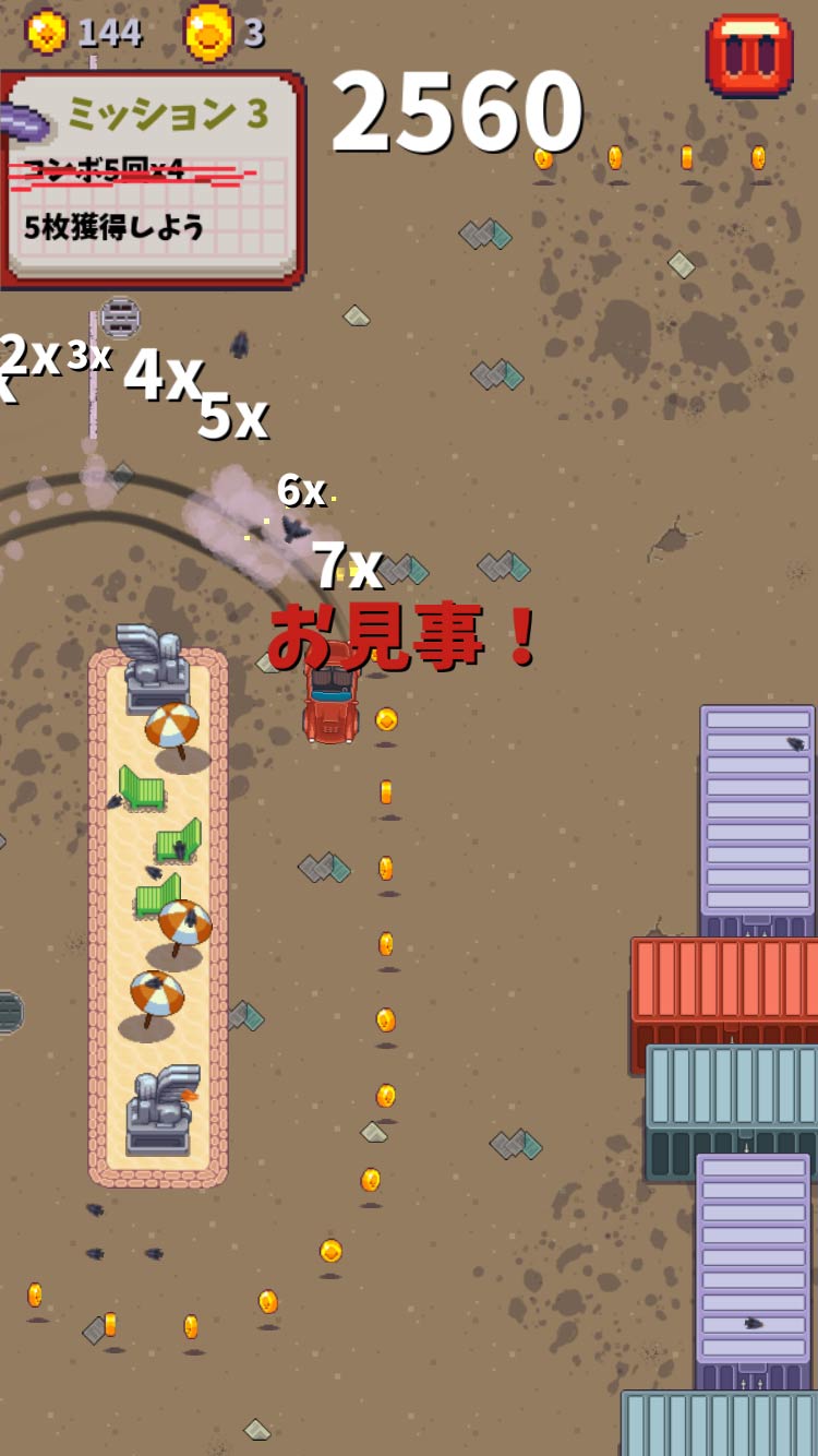 画面上に表示される生存タイム(スコア)と同じく重要なのが、画面左上に並んだ各種ミッション。「連続でコインを獲得する」「ステージ内に出没する鳥を追い払う」などのミッションを達成すれば、より高難度のミッションが登場。クリア内容によっては、報酬として特別な車が貰えます。
