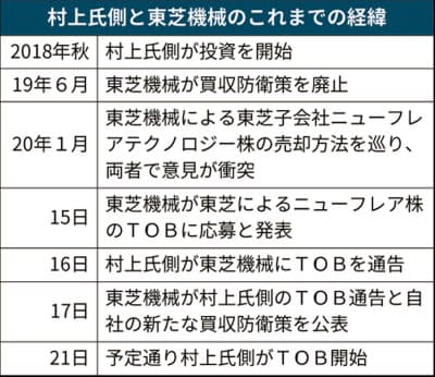 村上氏側は東芝機械が19年に買収防衛策を廃止したにもかかわらず、取締役会決議のみで買収防衛を図る点を「不当」と判断。東芝機械の方針に沿わず、TOBを開始するとした。