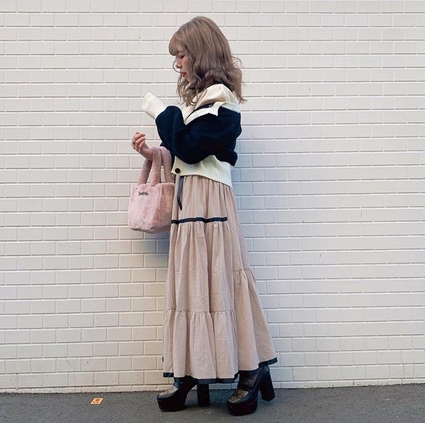 ティアードスカートを持っているけれど、何と組み合わせたらいいか分からない……! なんて方は、スカートと同系色のカラーを合わせるテクを使ってみてください♡