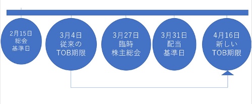 臨時株主総会で議決権を投じることができる株主は基準日が2月15日だったため、既に確定している。TOB期間が従来通り3月4日までの場合、TOBに応じると配当基準日の3月31日には株を持っていないため、TOB価格で株を売ってプレミアム(上乗せ)の恩恵を得るか、それとも配当の恩恵を受け取るか、どちらかの選択肢しかなかった。TOBが4月まで延長されたことで、株主は配当権利を確保した後にTOBに応じるといういわば「二重取り」も可能になった。既存株主にとっては明らかに朗報だろう。