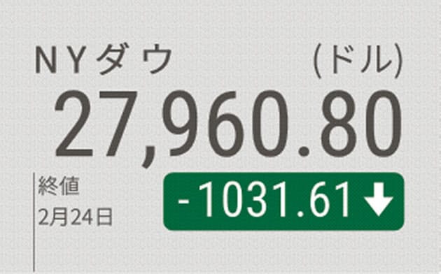【ニューヨーク=後藤達也】新型肺炎の拡大でマネーの萎縮が加速している。24日は欧州株の大幅安に続き、ダウ工業株30種平均も1031ドル安と急落。米長期金利も史上最低に迫った。感染がイタリアなどに拡散し、事態の収拾が見えづらくなったためだ。供給網の寸断が長期化し、米景気への警戒も強まり始めた。米国株は12日に史上最高値を付けたばかりで調整が深まる恐れもある。