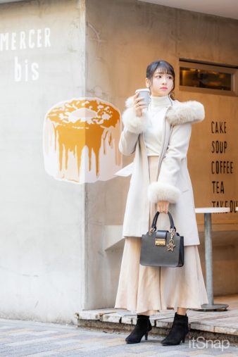 「全身をベージュと白でまとめたワントーンコーデにしてみました! 細身のシルエットがキレイで合わせやすいコート(Swingle)は、フードとそでのスソにファーが付いていているところが◎。中に着た白のニットトップス(VICKY)のそでのスソにもファーが付いるんです。ロングスカート(GALLARDAGALANTE)は淡いベージュの色味がいい感じで、ハイウエストでスタイルよく見えるアイテム。シンプルなショートブーツ(Odette e Odile)と星型チャームが可愛いバッグ(FURLA)は黒でまとめてみました!」