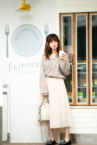 「春先まで着られるベージュのファーカーデ(SALON adam et rope’)と、大流行中のプリーツロングスカート(DHOLIC)を合わてワントーンベージュのフェミニンなイメージにしてみました。このカーデは前後逆にも着られて、ボタンの開け締めをすると3Wayで使えて着まわし力も抜群。NYのロゴがワンポイントになったファー付きパンプスは韓国で買ったアイテムで、ノーブランドなんですがルームシューズみたいで一目惚れ。仕上げに定番人気のSTELLA McCARTNEYのチェーンバッグ(ファラベラ)を合わせました!」