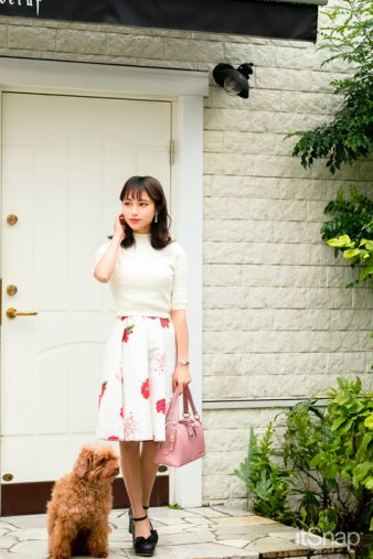 「コーデのメインは大きな花柄が印象的なSNIDELの異素材MIXワンピース。ふわっと広がったシルエットは流行りのプリーツでとっても可愛いんです。それに、春っぽいベビーピンクのボストンバック(JILLSTUART)を取り入れて差し色にしてみました。足元は黒パンプスなんですが、リボン付き&高めヒールで女性らしく。仕上げにお目立ちイヤリングでアクセントをON。キラキラのラインストーンがほどよく揺れて、コーデ全体に華やかさをプラスしてくれていい感じです」