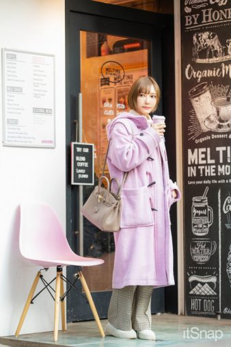 「普段はキレイめな格好をすることが多いんですが、今日はあえてカジュアルなスタイリングにしてみました。SNIDELのロングダッフルは淡いピンクがお気に入り。インナーは白ニット(TOMORROWLAND)、パンツはちょっぴりレトロなチェック柄パンツ(Spick and Span)を合わつつ、足元はemmi×adidasのスニーカーでカジュアル色を強めに。そして、合わせやすいグレーのショルダーバッグもダッフルと同じSNIDELで買ったものです!」