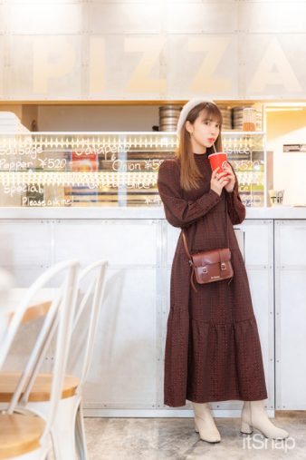 「コーデのテーマは“ハタチは大人の仲間入り”(笑)。主役アイテムのSLYの柄ワンピは大人っぽくてキレイなうえに、スソの広がりがいい感じで可愛らしさもある万能アイテム。色味をそろえたDr.Martensのレザーバッグもとってもお気に入りアイテムで、持つだけでオシャレに見えるしコンパクトでスタイルアップにつながるのも◎。ホワイトレザーのブーツ(niko and …)とファーのベレー帽(RETRO GIRL)を差し色にして、コーデが単調にならないようにアクセント付けしました」