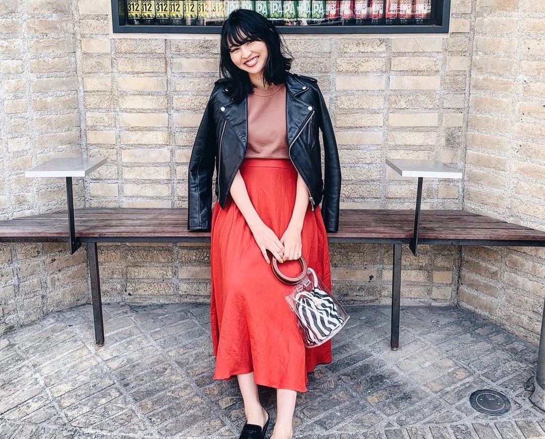 黒のライダースジャケットと合わせて、赤スカートを辛口にスタイリングしたこちらのコーデ。華やかな赤色もメンズライクなアイテムと合わせることで、モードでスタイリッシュな印象に仕上がっています。