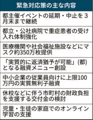 医療関連では、都として独自に業者と契約してマスク350万枚を調達し、医療機関などに優先供給する。都立・公社病院では重症患者の受け入れを強化するため、集中治療室(ICU)を増設。呼吸状態の悪化を防ぐ体外式膜型人工肺(ECMO)も導入する。感染症指定医療機関以外の病院でも治療ができるように病棟も用意する。