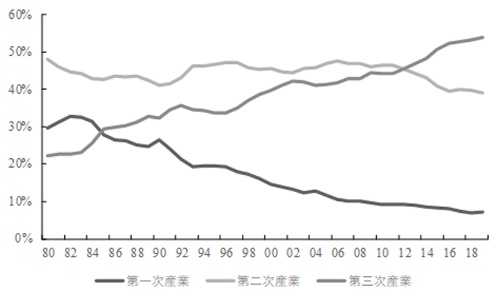 実際に、名目GDPの産業別構成比を見ると、改革開放直後の1980年では、第三次産業の比率は22.3%と、第二次産業(48.1%)どころか第一次産業(29.6%)よりも低い状況であった。その後、第三次産業の比率は、1985年には第一次産業を、2012年にはそれまで中国経済を支えてきた第二次産業を超え、2019年には53.9%にまで達している。