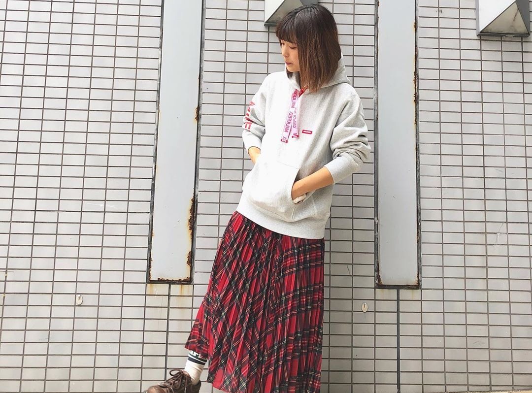こちらの赤チェックマキシ丈スカートは、ボアブルゾンやパーカーと合わせてカジュアルに着こなされています。トップスを白っぽい色でまとめることで明るい雰囲気です。髪をアップにしたり、厚底のブーツとコーディネートすることで、スタイル良く見えますね。冬コーデでも重くなりすぎないおしゃれなコーデのお手本です。