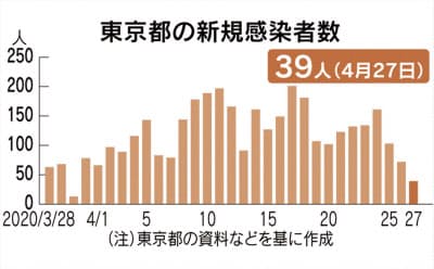 東京都は27日、新型コロナウイルスの感染者を新たに39人確認したと発表した。新規感染者が1日あたりで50人を下回るのは3月30日(13人)以来で、ほぼ1カ月ぶりとなる。100人を下回ったのは26日に続き2日連続。都内の感染者は累計で3947人となり、死者は6人増えて106人となった。
