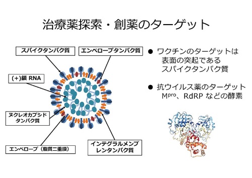 さて次に治療薬です。さて、ワクチンはSタンパクが主なターゲットになるのですけれども、抗ウイルス薬のターゲットは、メインプロテアーゼ、ORF1abなどの酵素です。